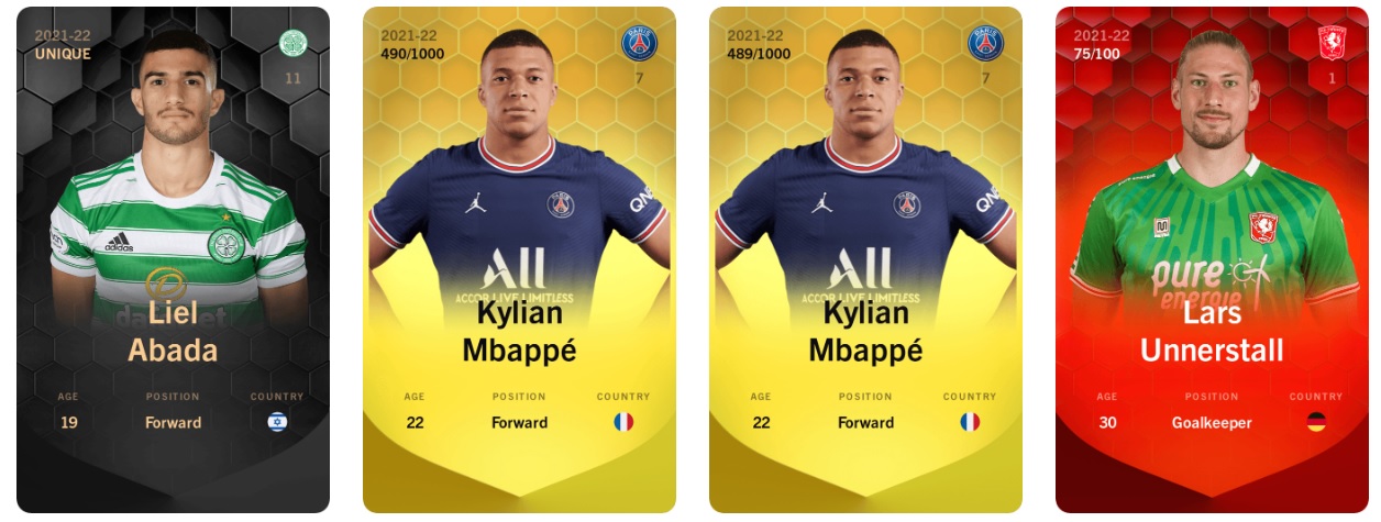 Tous les autres types de carte sont des cartes NFT payantes. Les cartes limited (jaunes) : il en existe 1000 par saison par footballeur présent dans le jeu. Ce sont les cartes les moins chères. Puis ensuite viennent les cartes rares (rouge) avec 100 exemplaires, super rares (bleu) avec 10 exemplaires et 1 exemplaire unique (noir).